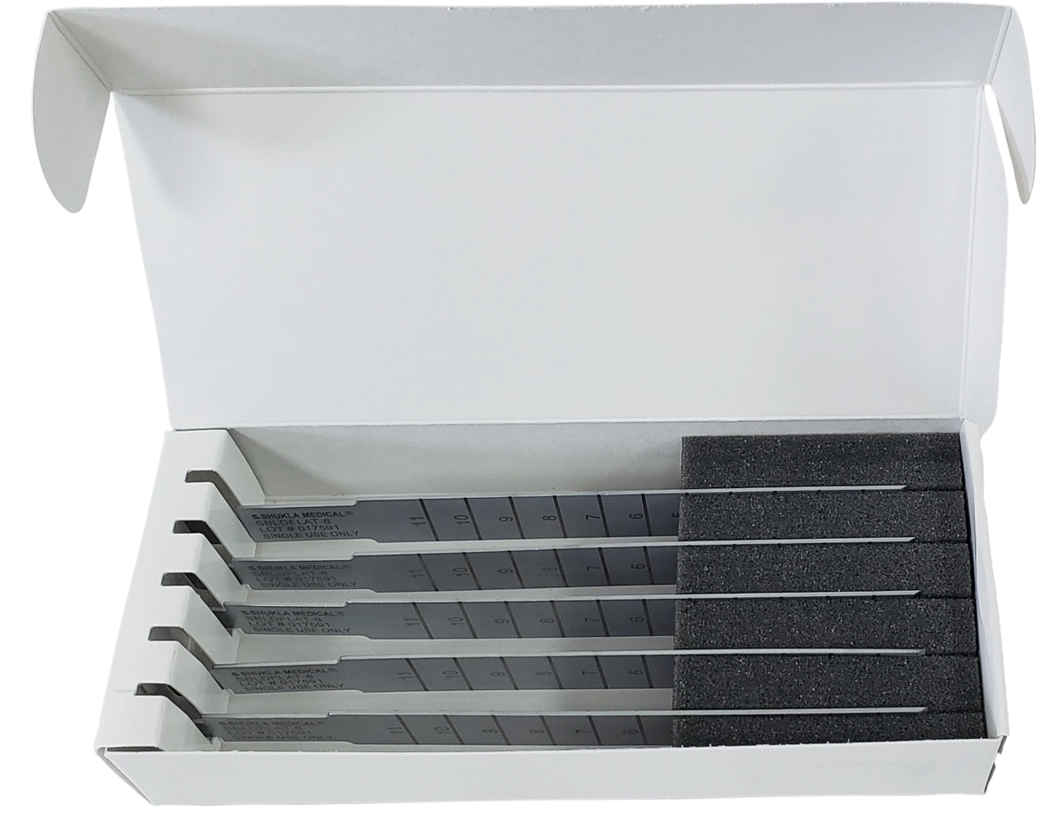 All flexible osteotome blades in the SHUKLA Blade are designated as single-use. Shukla Medical offers reorder boxes of 5 blades at a discounted price versus buying five blades separately.